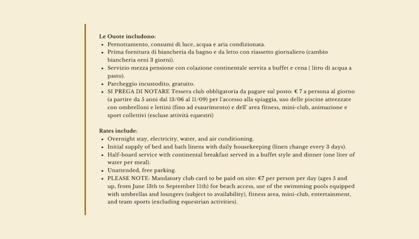club card €7 per person per day (mandatory from 5 years old from 1406 to 1209) for beach access, use of swimming pools, fitness area, mini club, entertainment and group sports (excluding equestrian activities, canoeing and pedal boats)."This property will not accommodate hen, stag or similar parties.