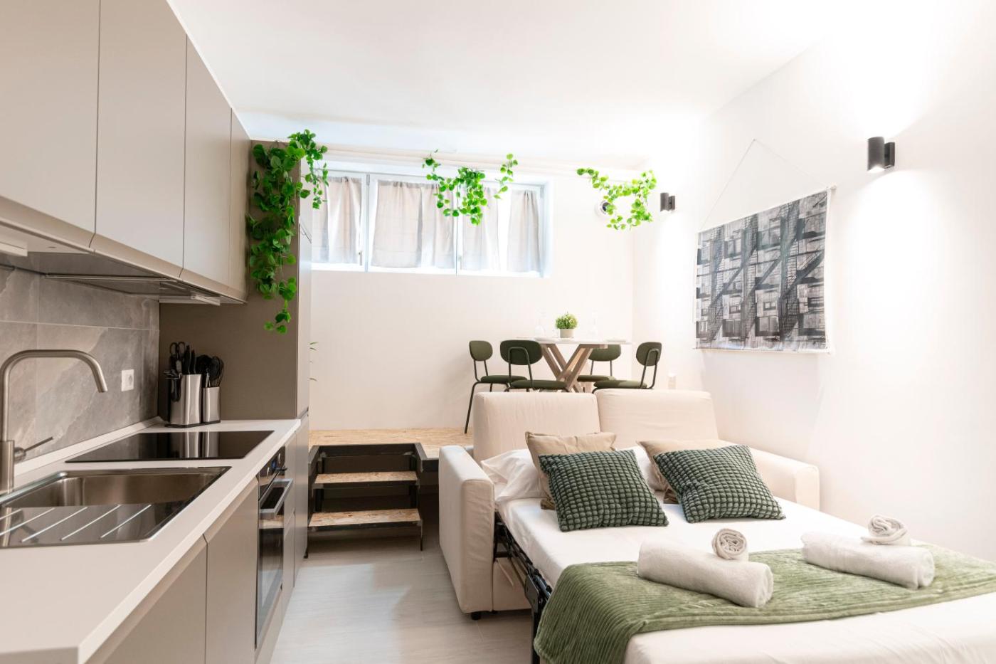 One-Bedroom Apartment. This air-conditioned apartment comes with 1 living room, 1 separate bedroom and 1 bathroom with a shower. Guests can make meals in the kitchen that features a stovetop, a refrigerator, kitchenware and an oven. The apartment features a washing machine, a tea and coffee maker, a seating area, a dining area and a flat-screen TV. The unit has 2 beds. ;