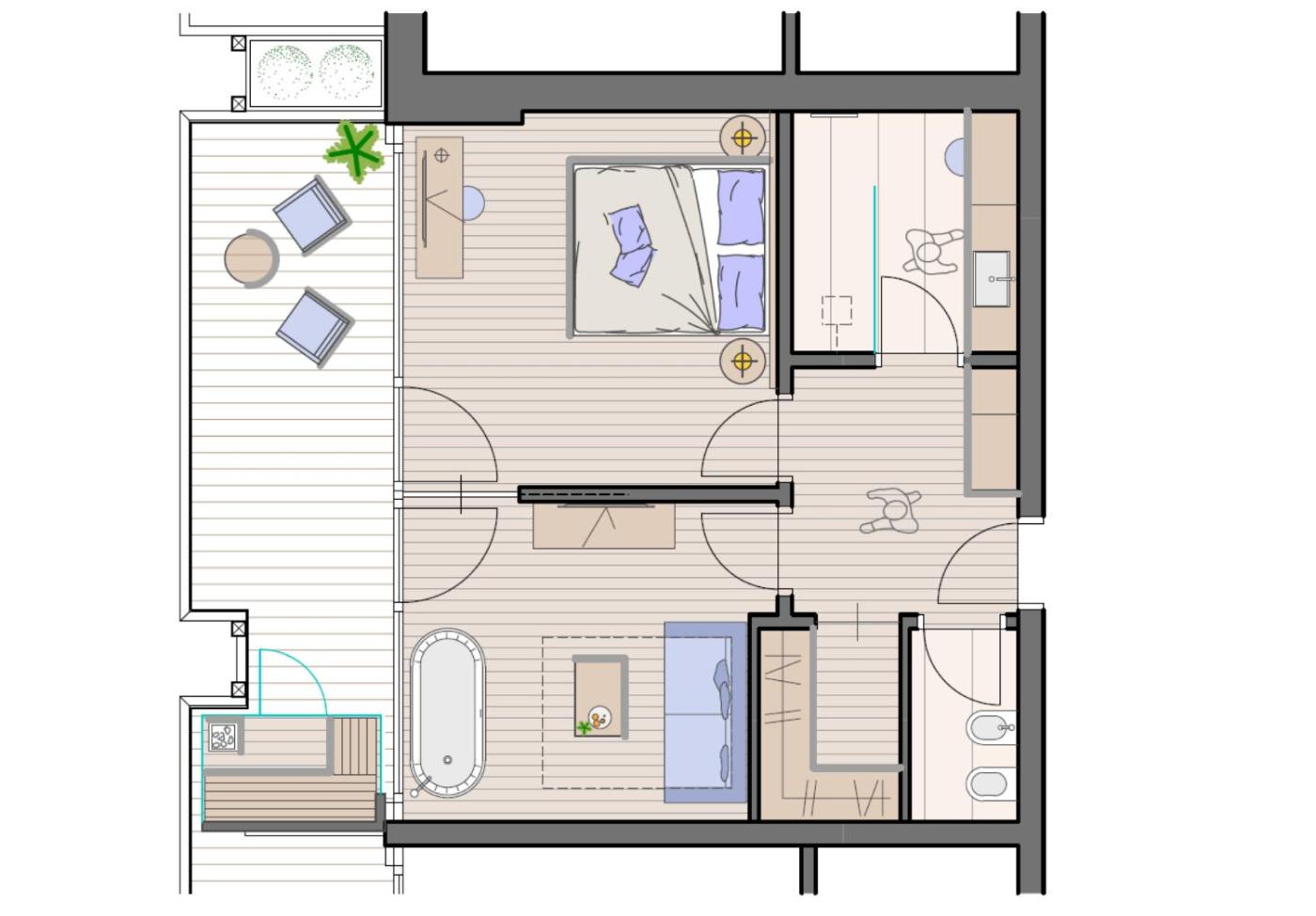 Junior Suite with Sauna. Boasting a private entrance, this suite includes 1 living room, 1 separate bedroom and 1 bathroom with a shower and a bidet. Featuring a terrace with mountain views, this suite also offers a washing machine and a flat-screen TV with satellite channels. The unit has 2 beds. ;