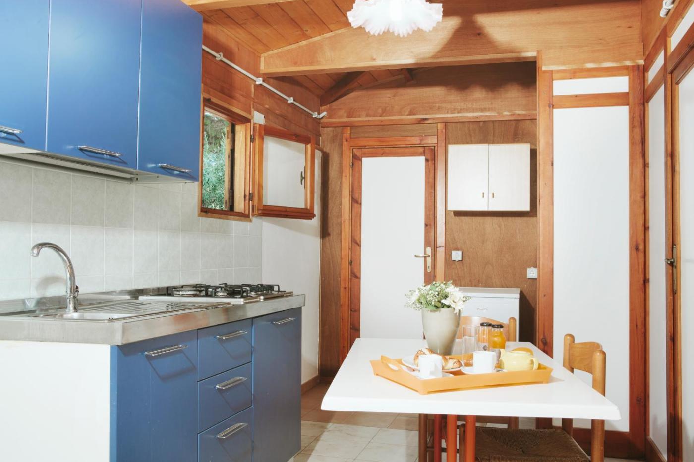 Chalet (2 people). Features a double bedroom, living room with kitchenette, and a covered patio. Please note that air conditioning is available on request and a supplementary charge of € 40.00 per 24 (non-continuous) hours of usage applies Please note that the accommodation has a solar hot water system for 200 litres per day. Small pets are allowed at a supplement. ;