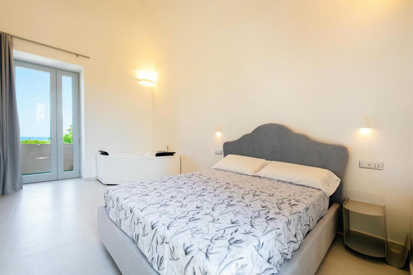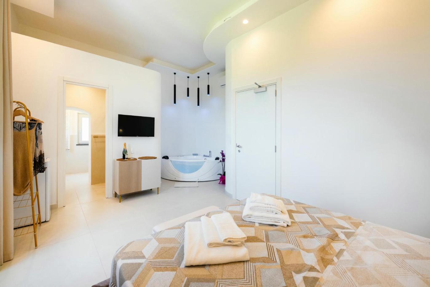 Double Room with Spa Bath. This luxurious double room offers a private pool, a hot tub and a spa bath. Featuring free toiletries, this double room includes a private bathroom with a shower, a bidet and a hairdryer. The spacious air-conditioned double room features a flat-screen TV with cable channels, a private entrance, soundproof walls, a tea and coffee maker as well as sea views. The unit has 1 bed. ;