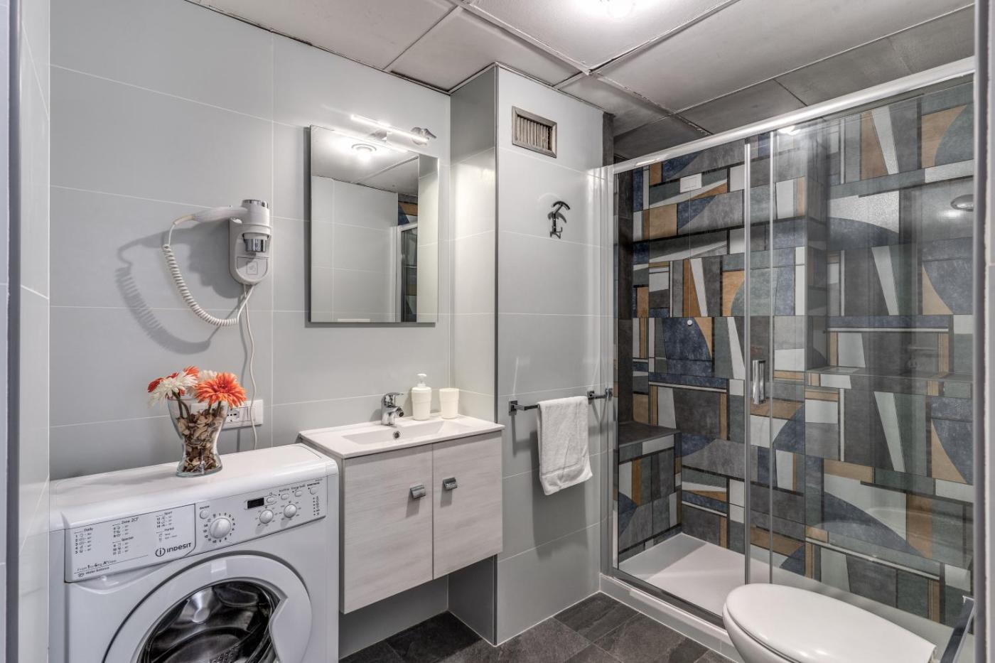 One-Bedroom Apartment. This air-conditioned apartment is comprised of 1 living room, 1 separate bedroom and 1 bathroom with a shower. In the well-fitted kitchen, guests will find a stovetop, a refrigerator, kitchenware and a microwave. The apartment offers a washing machine, a tea and coffee maker, a seating area, a flat-screen TV, as well as ancourtyard view. The unit offers 2 beds. ;