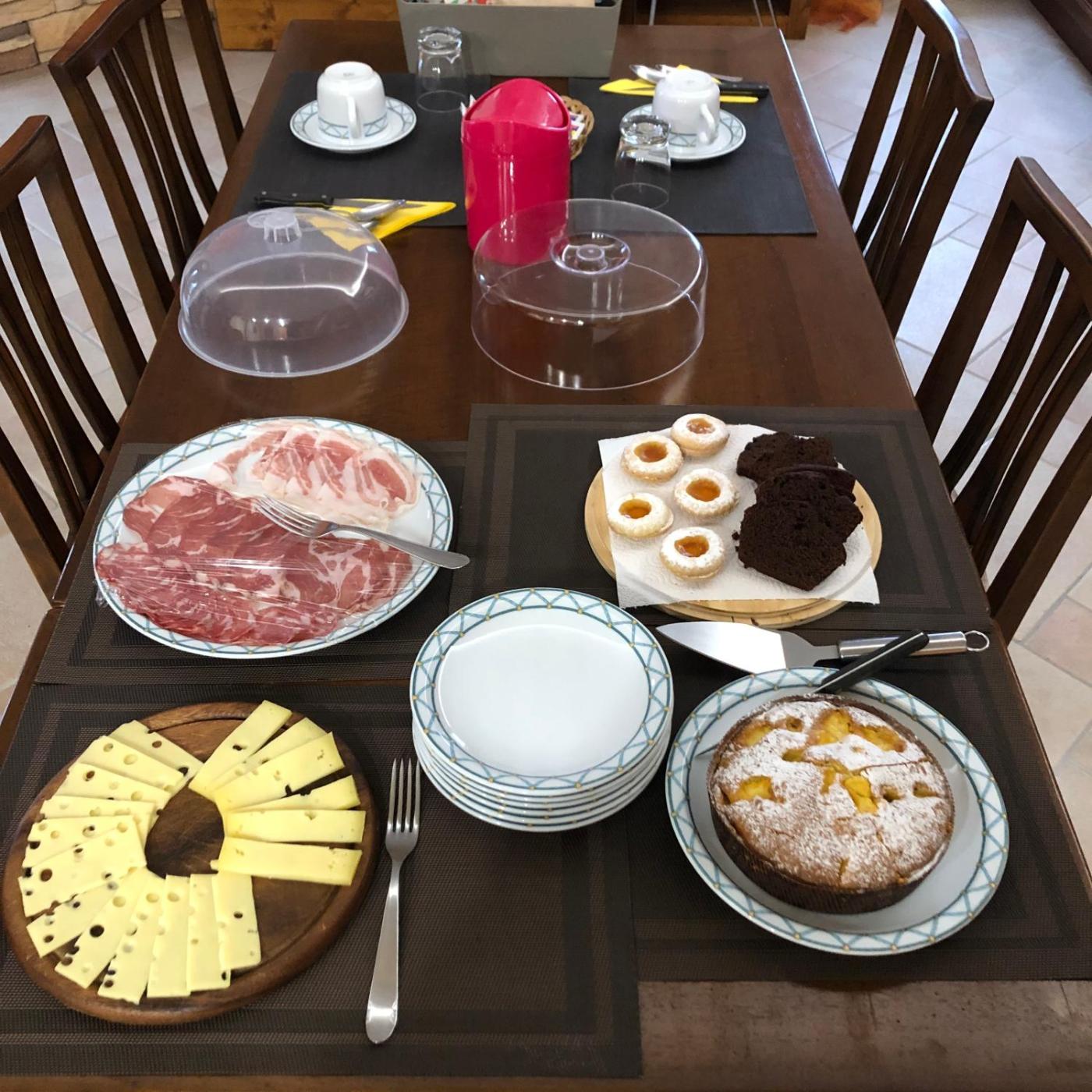 A selection of options including fresh pastries and juice is served for the Italian breakfast.